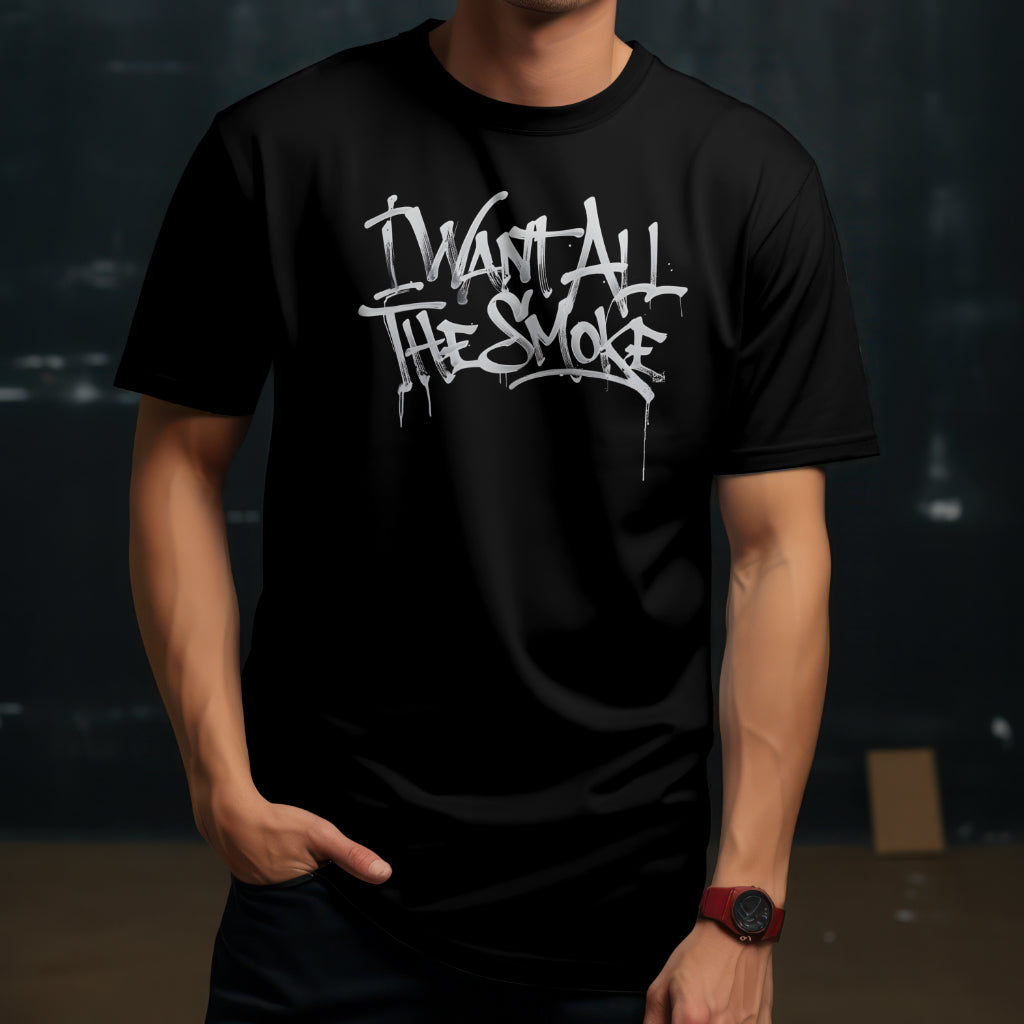 Keywords: GrafPunk T-shirt, street style, urban clothing, edgy tee, graffiti shirt, rebel fashion, "I Want All The Smoke" tee, statement shirt, raw streetwear, alternative fashion.