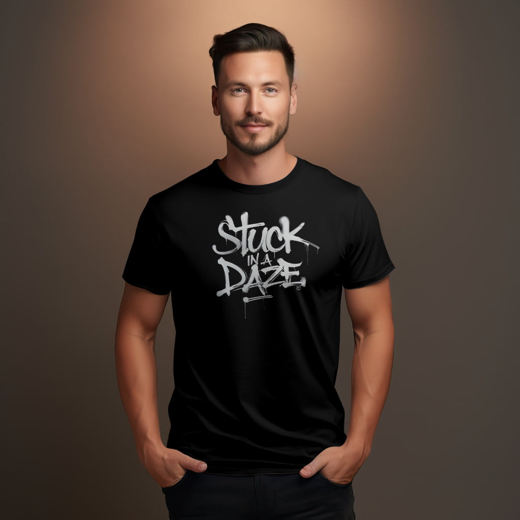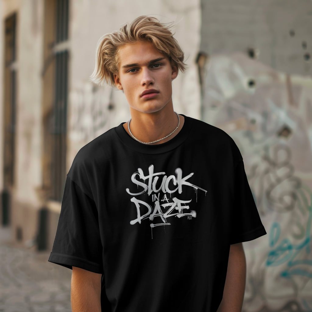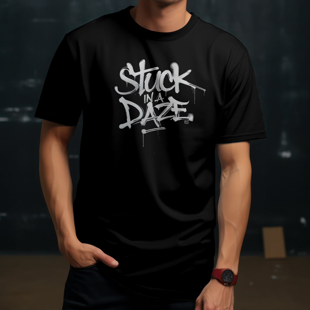 The GrafPunk "Stuck in a Daze" T-shirt is a bold statement piece that captures the essence of the GrafPunk ethos. The graphic design, featuring the phrase "Stuck in a Daze" in a graffiti-inspired font, is a visual representation of the brand's rebellious spirit and its rejection of conformity.